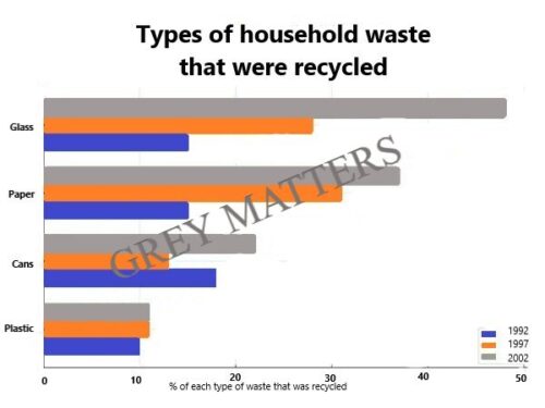 The chart below shows the percentages of different types of household waste that were recycled in one city between 1992 and 2002.